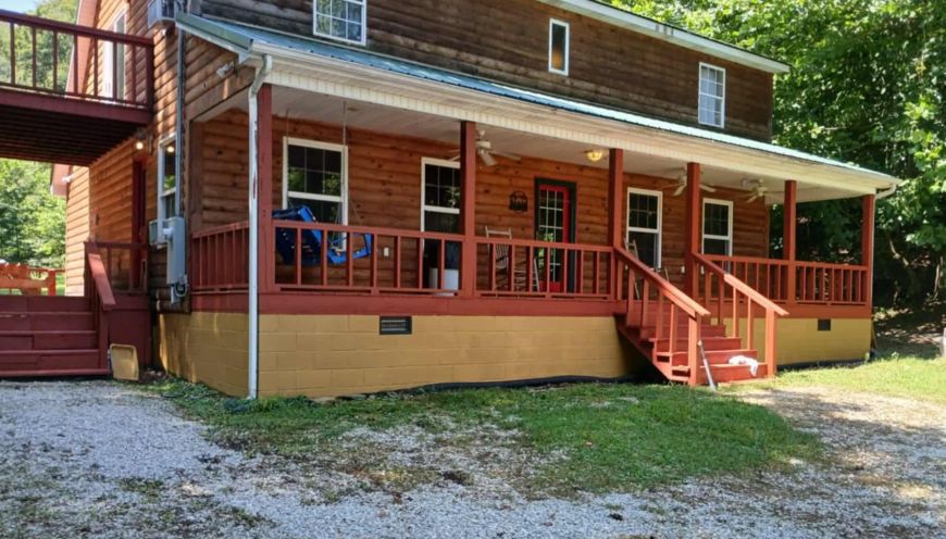 Our newly renovated Radnor Hollow Bunkhouse is a modern log cabin with a wide open floor plan and a unique design that lends itself to large parties of up 20 to people, with plenty of parking for ATVs, trailers and vehicles. This two-story, handcrafted log home is nestled in Radnor Hollow next to a relaxing, babbling brook and surrounded by trees.